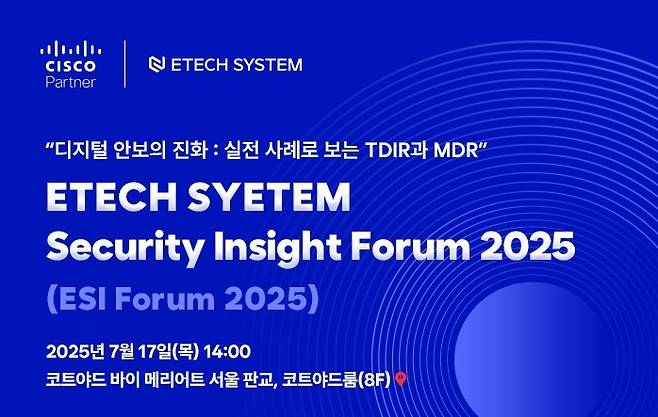 이테크시스템이 오는 17일 판교 코트야드 바이 메리어트에서 '이테크시스템 시큐리티 인사이트 포럼 2025(ESI Forum 2025)'를 개최한다.