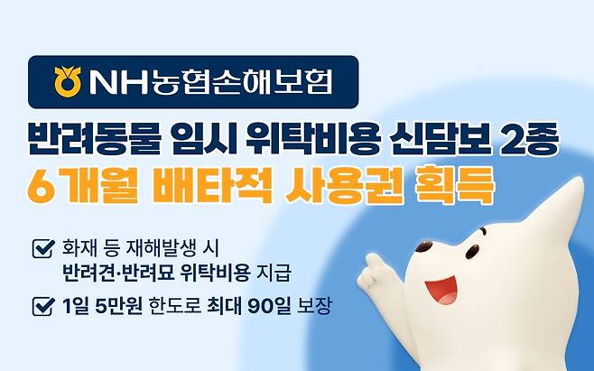 NH농협손해보험은 반려동물 임시 위탁비용 신담보 2종에 대해 6개월간 배타적 사용권을 획득했다고 9일 밝혔다.