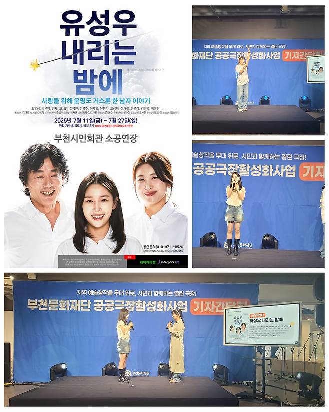 부천문화재단(대표이사 한병환)이 지난 8일 오후 2시 부천시민회관 소공연장에서 '공공 극장 활성화 사업'의 취지를 소개하고 참여 창작 공연의 주요 장면을 시연하는 기자 간담회 행사를 개최했다. 올해는 3개 단체가 선정됐는데, 연극 2편, 뮤지컬 1편으로 작품 별 3주간의 이례적인 장기 공연에 도전한다.