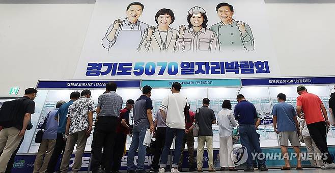 (수원=연합뉴스) 홍기원 기자 = 9일 경기도 수원시 권선구 수원메쎄에서 열린 '경기도 5070 일자리 박람회'에서 구직자들이 채용정보 게시판을 살펴보고 있다. 2025.7.9