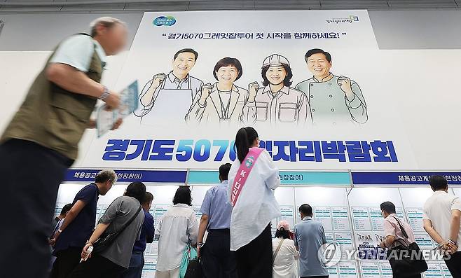 (수원=연합뉴스) 홍기원 기자 = 9일 경기도 수원시 권선구 수원메쎄에서 열린 '경기도 5070 일자리 박람회'에서 구직자들이 채용정보 게시판을 살펴보고 있다. 2025.7.9