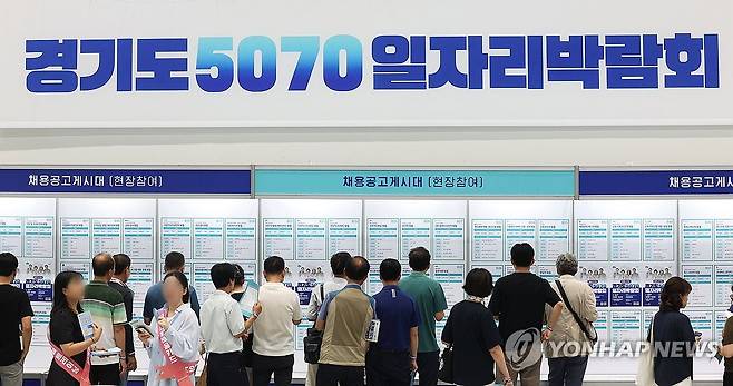 (수원=연합뉴스) 홍기원 기자 = 9일 경기도 수원시 권선구 수원메쎄에서 열린 '경기도 5070 일자리 박람회'에서 구직자들이 채용정보 게시판을 살펴보고 있다. 2025.7.9