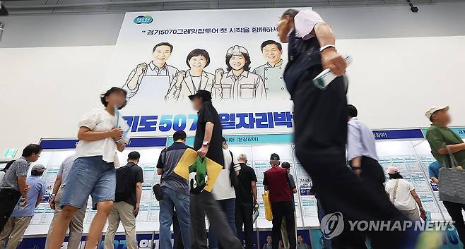 (수원=연합뉴스) 홍기원 기자 = 9일 경기도 수원시 권선구 수원메쎄에서 열린 '경기도 5070 일자리 박람회'에서 구직자들이 채용정보 게시판을 살펴보고 있다. 2025.7.9