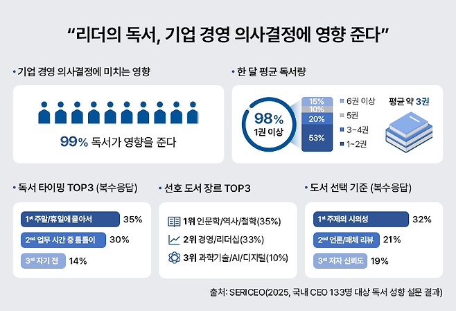 이번 설문은 지난 5월 16일부터 10일간 진행되었으며, 총 133명의 국내 CEO와 24명의 전문가가 참여했다. 설문 결과, 독서는 리더에게 단순 취미가 아닌 실질적인 경영수단으로 여겨지고 있었으며 리더들은 바쁜 일정 속에서도 전략적으로 독서를 실천하는 것으로 나타났다.
