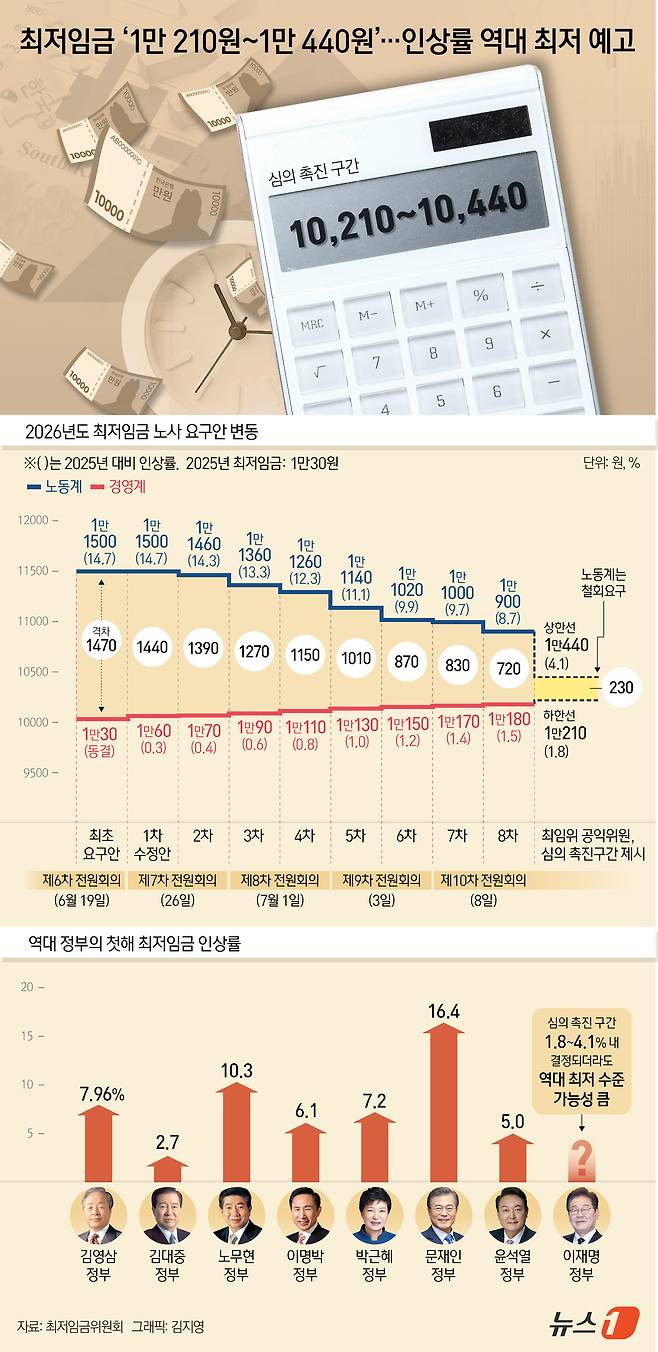(서울=뉴스1) 김지영 디자이너 = 2026년도 최저임금을 두고 노사가 간극을 좁히지 못하자 최저임금위원회(최임위) 공익위원들이 내년 최저임금을 1만 210원~1만 440원 사이에서 정하자는 '심의 촉진 구간'을 제시했다. 최임위는 오는 10일 제12차 전원회의를 다시 열고 최저임금 심의를 이어갈 예정이다.