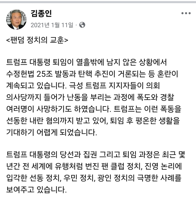 - 대미특사 김종인, 과거 SNS서 “트럼프 광인정치”