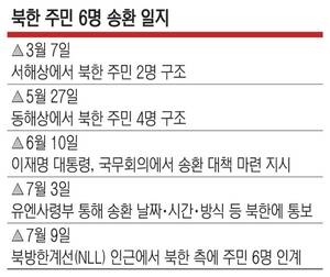 9일 통일부 당국자는 "정부는 지난 3월과 5월 동해상에서 구조된 북한 주민 6명을 오늘 오전 9시께 동해상으로 함께 송환했다"며 "결과적으로 원활하고 안전한 송환이 됐다"고 말했다.