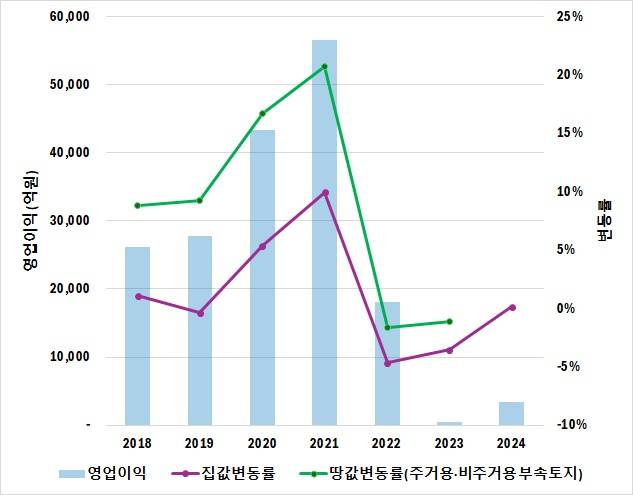 | ▲ LH 영업이익 : 공공기관 경영정보 공개시스템(alio.go.kr) 집값변동률·땅값변동률 : 한국은행경제통계시스템(ecos.bok.or.kr) |