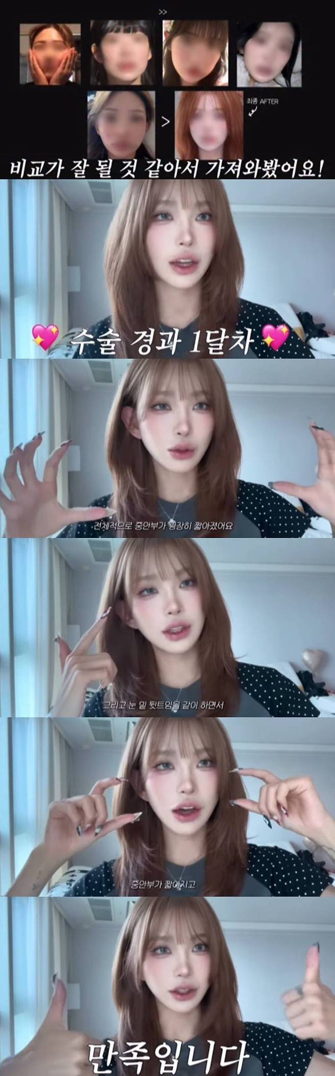 그는 "한 달 정도 된 저의 모습이다. 제가 느끼기로는 중안부가 굉장히 짧아졌다. 눈 밑 뒤트임을 같이 하면서 면적 자체가 줄어들면서 눈이 확 커진 느낌"이라고 전했다.
