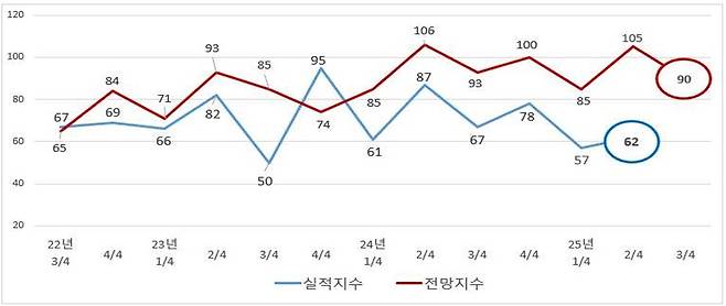 이어 2/4분기 BSI 실적지수는 '62'로 전 분기(57) 대비 소폭 상승했으나, 여전히 기준치(100)를 크게 밑돌아 실적 회복은 제한적인 수준에 머무르고 있다. 부문별 실적지수는 매출액(69), 영업이익(63), 자금사정(63) 등 대부분 항목이 기준치를 밑돌며 경영 부담이 큰 상황으로, 3/4분기 부문별 전망지수는 매출액(99), 영업이익(93), 설비투자(96), 자금사정(79)으로 나타났으며, 설비투자와 매출액 지수는 기준치에 근접했지만 영업이익과 자금부문은 여전히 기준치에 미치지 못해 수익성과 유동성 부담이 이어질 전망이라고 설명했다.