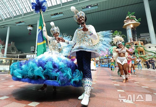 [서울=뉴시스] 이영환 기자 = 9일 서울 송파구 롯데월드 어드벤처에서 태양의 여신과 삼바 댄서들이 삼바 카니발 퍼레이드를 선보이고 있다.