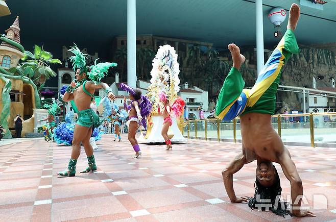 [서울=뉴시스] 이영환 기자 = 9일 서울 송파구 롯데월드 어드벤처에서 태양의 여신과 삼바 댄서들이 삼바 카니발 퍼레이드를 선보이고 있다.