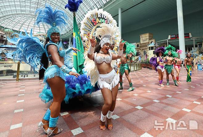 [서울=뉴시스] 이영환 기자 = 9일 서울 송파구 롯데월드 어드벤처에서 태양의 여신과 삼바 댄서들이 삼바 카니발 퍼레이드를 선보이고 있다.