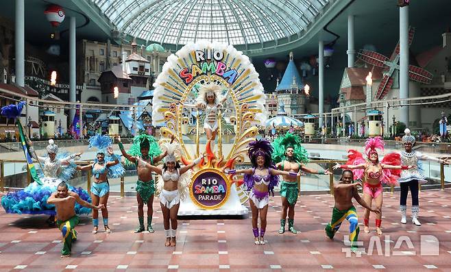 [서울=뉴시스] 이영환 기자 = 9일 서울 송파구 롯데월드 어드벤처에서 태양의 여신과 삼바 댄서들이 삼바 카니발 퍼레이드를 선보이고 있다.