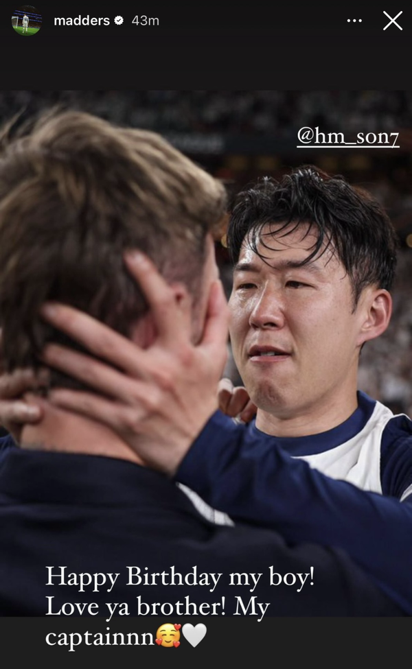 이렇듯 영국 현지에서는 ‘손흥민 이탈설’을 줄기차게 주장하고 있지만, ‘부주장’ 매디슨은 손흥민을 향한 변함없는 지지와 애정을 보냈다. 매디슨은 8일(한국시간) 개인 SNS를 통해 UEL 우승 직후 손흥민과 함께있는 사진 한 장을 게재하며 “생일 축하해 내 친구! 사랑해 브라더! 우리 주장님”이라는 애정이 담긴 문구를 남겼다. 33번째 생일을 맞은 손흥민 또한 매디슨의 게시물을 리그램하며 우정을 과시했다.