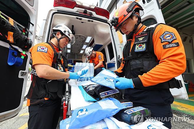 (인천=연합뉴스) 임순석 기자 = 연일 폭염이 이어지고 있는 9일 인천 부평구 부평소방서에서 119구급대원들이 온열질환자 발생에 대비해 아이스팩, 생리식염수 등 폭염 대비 물품을 점검하고 있다. 2025.7.9