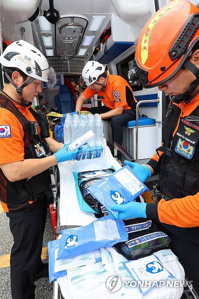 (인천=연합뉴스) 임순석 기자 = 연일 폭염이 이어지고 있는 9일 인천 부평구 부평소방서에서 119구급대원들이 온열질환자 발생에 대비해 아이스팩, 생리식염수 등 폭염 대비 물품을 점검하고 있다. 2025.7.9