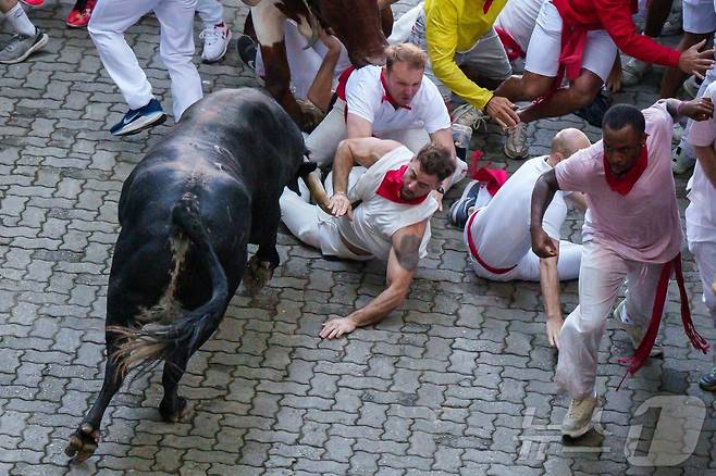 (팜플로나 AFP=뉴스1) 김경민 기자 = 스페인 북부 팜플로나에서 열린 산 페르민 축제 엔시에로 행사에서 한 참가자가 황소에 맞아 넘어지고 있다. 2024.7.8