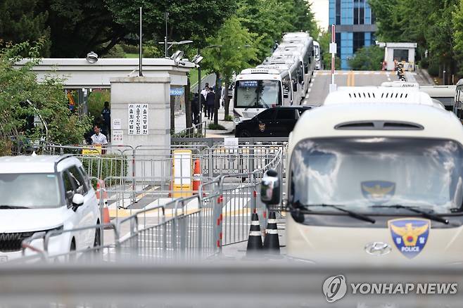 (서울=연합뉴스) 윤동진 기자 = 윤석열 전 대통령의 영장실질심사가 열린 9일 서울 서초구 서울중앙지법 인근에 차벽이 설치돼 있다. 2025.7.9