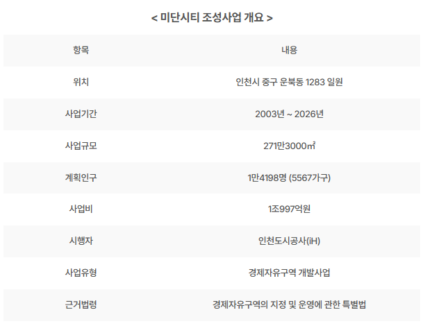 2007년 6월 iH와 미단시티개발은 106만㎡를 6694억원에 공급하기로 계약을 맺었다. iH는 2008년 9월 미단시티 조성공사에 들어가 2011년 12월 1단계 조성공사를 마쳤다.