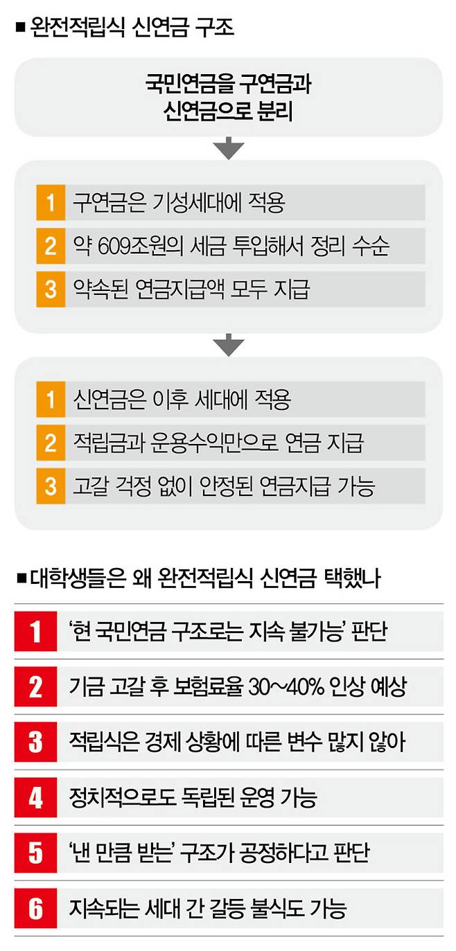 ✚ 최윤성 : "일정 세대를 기준으로 연금 구조를 두개로 나누는 겁니다. 기성세대를 대상으로 하는 구연금은 현재의 시스템대로 정리(기금 적립금 고갈까지)하고, 이후 세대의 국민연금은 '완전적립식(개인 계좌별 저축+운용수익금=연금액) 신연금'으로 바꾸자는 겁니다."