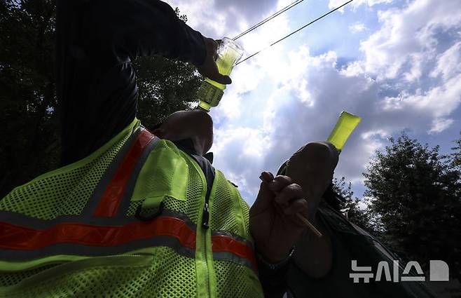 [서울=뉴시스] 김근수 기자 = 연일 폭염이 지속되는 가운데 9일 서울 시내의 한 건설현장 노동자가 더위를 식히기 위해 이온음료를 마시고 있다. 2025.07.09. ks@newsis.com