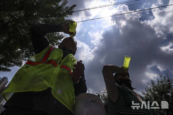 [서울=뉴시스] 김근수 기자 = 연일 폭염이 지속되는 가운데 9일 서울 시내의 한 건설현장 노동자가 더위를 식히기 위해 이온음료를 마시고 있다. 2025.07.09. ks@newsis.com