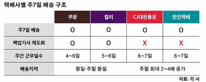 실제로 쿠팡로지스틱스서비스(CLS)는 기본 인력 외에 추가로 주 4일 근무하는 '백업 기사'가 있는 택배영업점만 계약을 체결한다. 여기에 직고용한 배송 인력인 '쿠팡친구'도 운영하고 있다. 이를 통해 배송기사 1명당 업무량과 지역 커버리지가 늘어나지 않고, 주 4~6일 근무가 가능한 시스템을 갖췄다. 일례로 하루에 3개 지역에 각각 배송하는 기사 3명 가운데 2명이 주 5일 근무하고, 1명이 주 6일 근무를 한다면 주 5일 근무할 백업 기사 1명을 충원하는 방식이다. 컬리도 이와 비슷한 기준으로 택배영업점과 계약을 맺고, 직고용 배송 인력인 '샛별크루' 규모를 지속적으로 확충하고 있다.