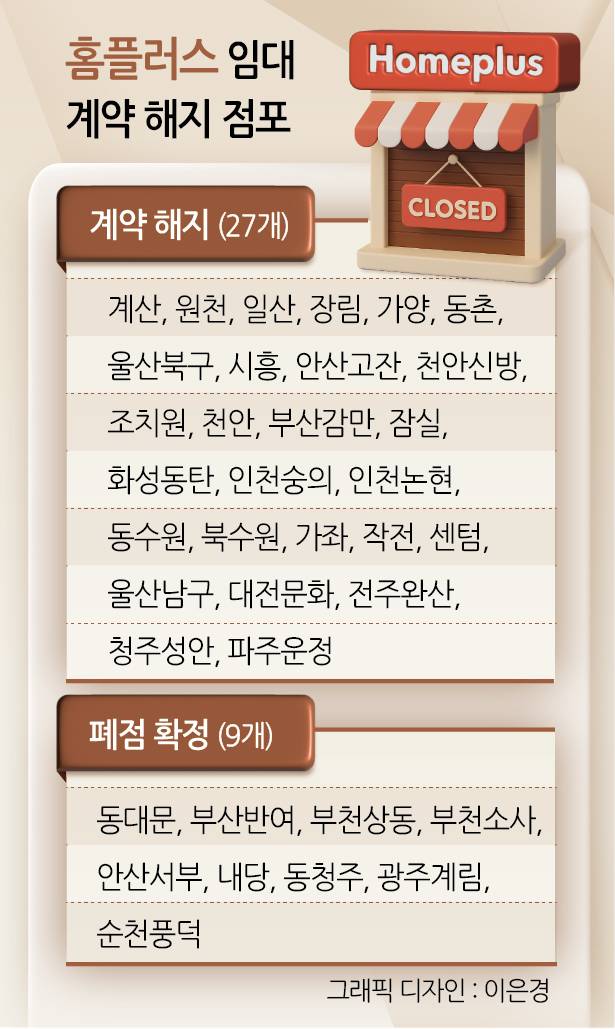 불안에 떠는 지점은 가양점만이 아니다. 계산, 원천, 일산, 장림, 가양, 동촌, 울산북구, 시흥, 안산고잔, 천안신방, 조치원, 천안, 부산감만, 잠실, 화성동탄, 인천숭의, 인천논현, 동수원, 북수원, 가좌, 작전, 센텀, 울산남구, 대전문화, 전주완산, 청주성안, 파주운정점 등 27개 점포가 임대계약 해지 대상이다. 계약이 성사되지 않으면 폐점밖에 택할 길이 없다.