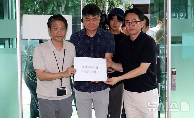 [서울=뉴시스] 추상철 기자 = 정용철(왼쪽부터) 체육시민연대 공동대표, 이대택 스포츠 인권 연구소 대표, 김현수 체육시민연대 집행위원장이 9일 오후 서울 종로구 서울경찰청에서 유승민 대한체육회장 비리 고발장을 제출하기 위해 이동하고 있다. 2025.07.09. scchoo@newsis.com