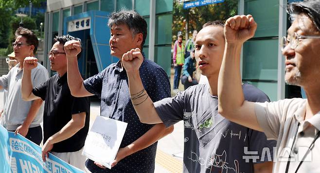 [서울=뉴시스] 추상철 기자 = 9일 오후 서울 종로구 서울경찰청 앞에서 열린 '유승민 대한체육회장 비리 고발' 기자회견에서 체육시민민연대, 스포츠 인권 연구소 대표 등이 구호를 외치고 있다. 2025.07.09. scchoo@newsis.com