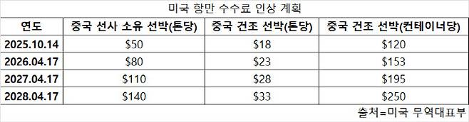 중국산 선박에 대한 항만 수수료는 2028년까지 시간이 흐를수록 단계적으로 높아지는 구조다. 중국 선사가 소유한 선박에는 오는 10월 14일까지 톤당 50달러, 내년 4월 17일까지 톤당 80달러, 2027년 4월 17일까지 톤당 110달러, 2028년 4월 17일까지 톤당 140달러의 수수료가 부과된다.