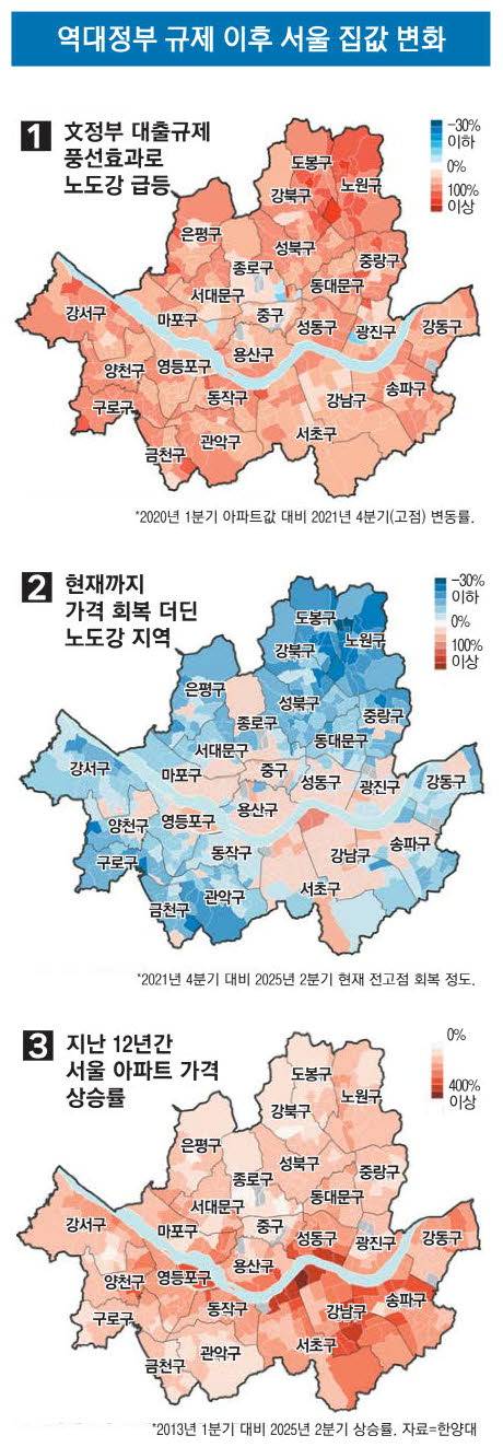 문제는 이후 고금리로 인한 하락기 풍선효과로 청년층의 영끌 성지가 된 노도강의 급락이다. 2025년 2분기를 기준으로 이전 고점(2021년 4분기) 대비 -30%에 가까운 급락 추이를 회복하지 못한 곳도 있다(지도 2). 최근 문재인 정부 당시 상대적으로 상승이 억제되고, 급락기 하락폭이 작았던 강남구를 포함한 한강변 자치구들의 회복세에 더해 압구정동 등 한강에 인접하고 재건축 기대가 강해지는 행정동들은 회복세를 넘어 급등세가 발생하고 있다. 이런 국지적으로 양극화된 가격 변동 추이는 그동안 발생한 시민들의 한강 조망에 대한 선호체계 변화와 인구축소기를 대비한 안정적인 자산에 대한 수요, 다주택자 규제로 내몰린 똘똘한 한 채에 대한 집착이 결합된 결과다.