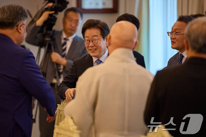 (서울=뉴스1) 허경 기자 = 이재명 대통령이 9일 서울 용산 대통령실에서 열린 종교 지도자 초청 오찬 간담회에서 참석자들과 인사하고 있다. (대통령실 제공. 재판매 및 DB 금지) 2025.7.9/뉴스1