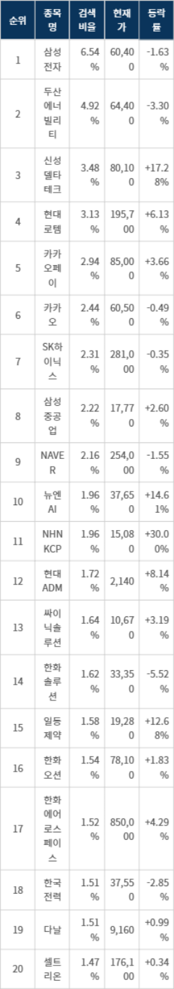 이어 검색비율 2위의 두산에너빌리티(034020)는 하락률 3.30%로 하락 마감했다. 검색비율 3위의 신성델타테크(065350)는 17.28% 상승 마감했다. 검색비율 4위 현대로템(064350)은 상승률 6.13%로 상승했다. 검색비율 5위 카카오페이(377300)는 3.66% 상승하며 마감했다.