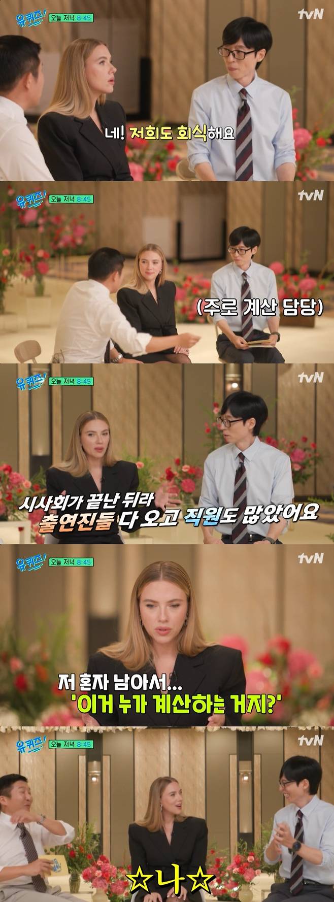 스칼렛 요한슨, '유퀴즈'서 할리우드 회식 썰 푼다 "나랑 계산서만 남아"