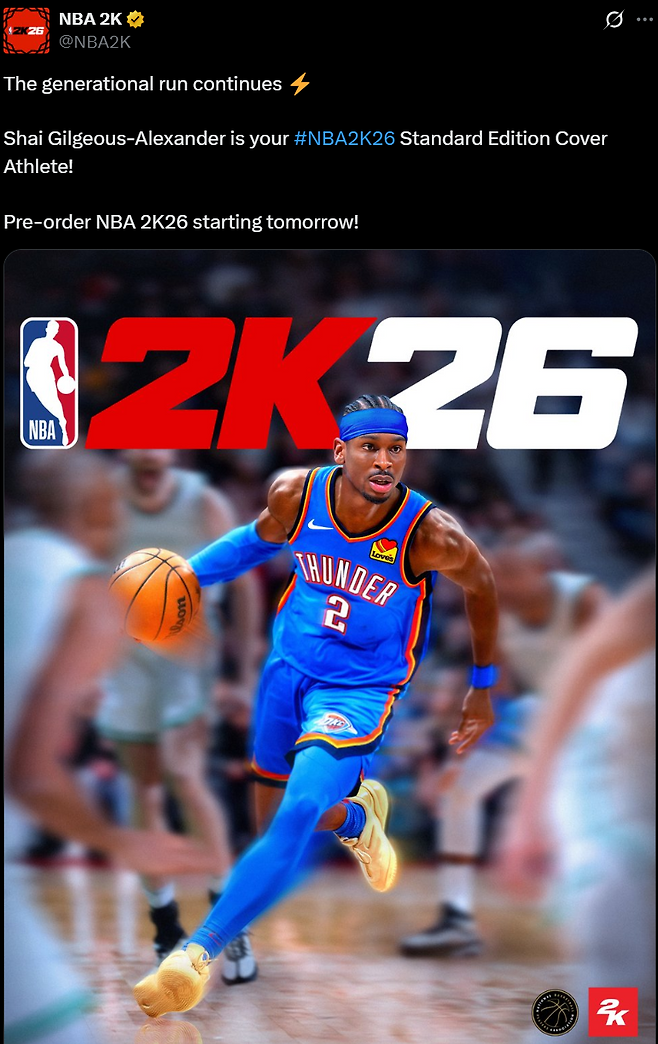 NBA 2K26 표지 모델, 르브론도 커리도 아니었다…주인공은 'MVP' SGA