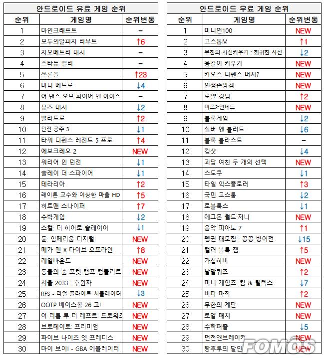 안드로이드 무료 게임 순위에서는 미니언을 모아 전투를 펼치는 '미니언100'이 1위를 기록했다.