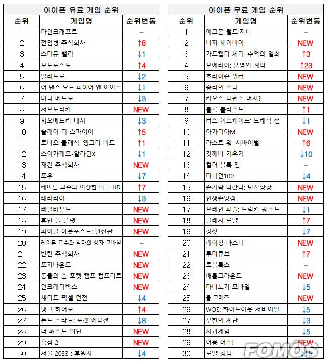 이와 함께 새롭게 차트에 오른 게임이 상위권을 기록했으며 지난주 상위권을 기록했던 인기 게임은 대부분 순위가 크게 하락한 모습을 보였다.