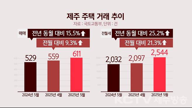 지난 5월 제주에서 매매 거래된 주택은 600여건으로 전달 대비 9.3% 늘었고 지난해 같은 달보다는 15.5% 증가했습니다.