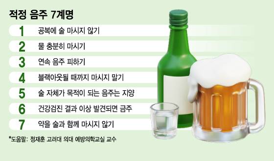 여섯째, 건강검진 결과에서 이상이 발견되면 술잔을 내려놔야 한다. 특히 간질환, 췌장 질환(당뇨병 포함), 심혈관 질환, 위장관 질환 등 건강검진 상 관련 질병이 발견된 사람은 금주가 필수다. 단, 효과적으로 관리되는 만성질환 땐 무조건적인 금주보다는 절제가 필요하다.