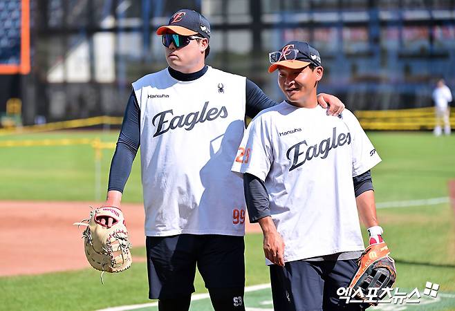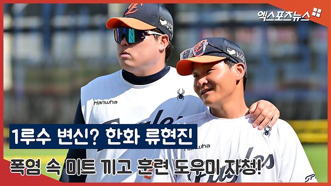 '한화 1루수가 누구야?' 류현진 '폭염 속 미트 끼고 훈련 도우미 자청'[김한준의 현장 포착]
