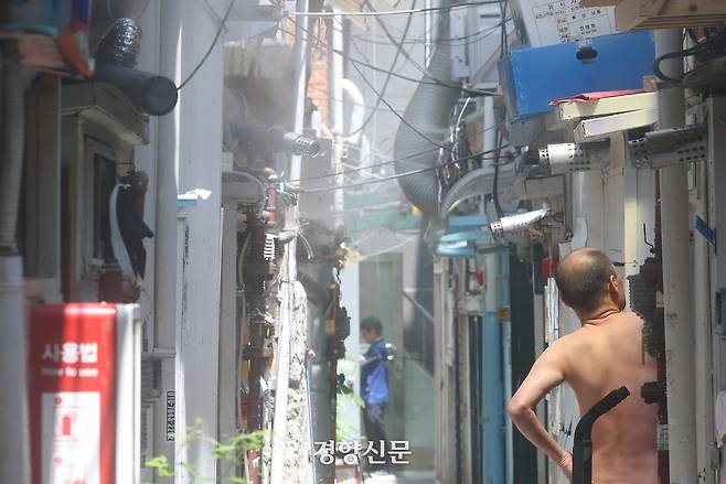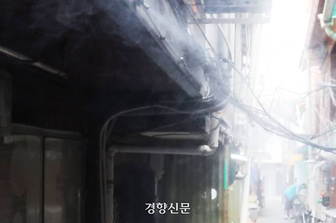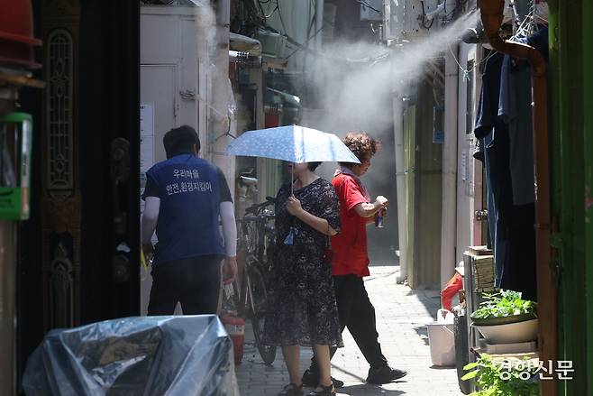 연일 폭염이 이어지고 있다. 서울 낮 기온이 36도까지 오른 9일 서울 종로구 돈의동 쪽방촌 골목에 설치된 쿨링포그가 작동했다. 미세한 물입자를 분사해 주변 온도를 낮추는 장치로, 주민들은 이를 통해 더위를 조금이나마 식혔다.