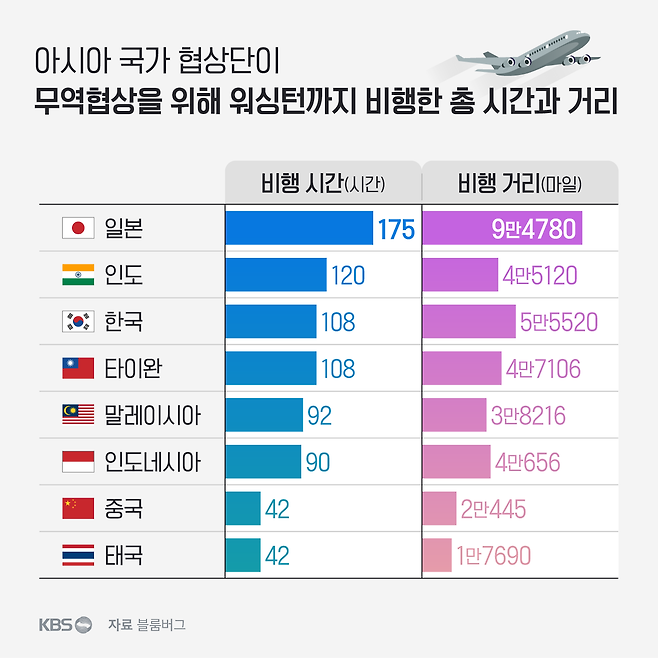 블룸버그는 세계 각국의 무역 협상단이 트럼프 대통령과 협상을 타결하기 위해 워싱턴 D.C.를 오갔다며, 특히 아시아 대표단은 가장 먼 거리를 오가야 했다고 짚었습니다.