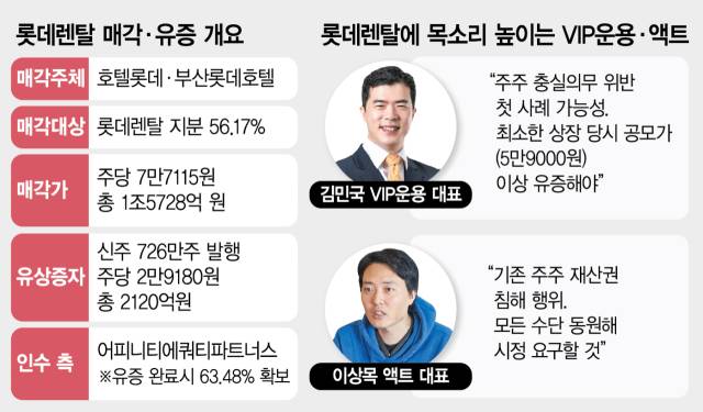 그러나 같은날 롯데렌탈 이사회는 어피니티를 대상으로 신주 726만주를 주당 2만 9180원, 총 2120억 원에 발행하는 유상증자를 결의했다. 대주주 매각가보다 약 62% 낮은 수준이다. 이에 VIP운용과 소액주주들은 자신들의 지분이 희석돼 재산권이 침탈됐다며 불만을 표시하고 나선 것이다. 롯데렌탈 매각·유증 건은 현재 공정위가 진행중인 기업결합심사 절차가 끝나는대로 최종 실행될 예정이다.