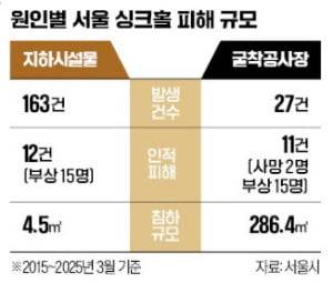 지하철 등 굴착 공사로 생기는 지반 침하는 발생 빈도는 낮지만 피해 규모가 크다. 서울시에 따르면 2015년부터 올해 3월까지 10년간 서울에서 굴착 공사로 인한 싱크홀 27건 중 11건(사망 2명, 부상 15명)에서 인명 피해가 발생했다. 상하수관 손상 등 지하시설물로 인한 사고는 총 163건으로 인명 피해가 12건(부상 15명)이었다. 사고 건수 대비 인명 피해 발생률을 살펴보면 굴착 공사장(40.7%)이 지하시설물(7.4%)의 다섯 배를 넘는다. 이번 명일동 싱크홀 사고 근처에서도 수도권 지하철 9호선 연장선 공사가 진행 중이었다. 부산도시철도 사상~하단선 건설 구간 인근에서 최근 2년간 14차례의 크고 작은 싱크홀이 발견됐다.