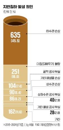 9일 지하안전정보시스템에 따르면 2018년부터 작년까지 전국에서 1396건의 지반 침하가 발생했다. 연평균 199건의 땅 꺼짐 사고가 터진 것이다. 올해는 지난달 30일까지 66건의 사고가 발생했다. 싱크홀 사고는 2022년 177건에서 지난해 102건으로 줄었지만, 인명 피해를 불러오는 깊이 5m 이상 대형 사고가 최근 연달아 터지고 있는 건 분명하다.
