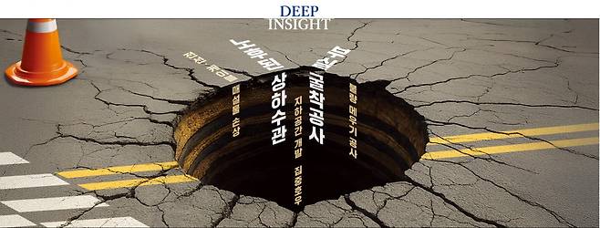 지하안전정보시스템에 따르면 최근 7년간 하수관이나 상수관 손상으로 지반 침하가 발생한 비율은 51.7%나 된다. 서울만 따로 떼서 살펴보면 이 비율이 63%(최근 10년 기준)로 더 높다. 환경부에 따르면 2023년 기준 전국 총하수관 17만2496㎞ 중 7만5837㎞(44%)가 20년 이상 된 노후 관로다. 30년 이상 비율도 26%(4만4633㎞)나 됐다. 지하시설물에는 상하수관 외에 열수송관, 지하차도, 공동구(전선, 수도관, 가스관, 전화 케이블 등을 함께 수용하는 지하 터널) 등도 있다.
