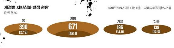 지난 3월 서울 강동구 명일동에선 지름 20m, 깊이 20m의 커다란 싱크홀이 발생해 30대 오토바이 운전자가 사망했다. 4월엔 경기 광명 신안산선 공사 현장의 지하터널이 붕괴해 1명이 숨졌다. 최근 인구가 밀집된 수도권에서 사고가 많아진 것도 불안감을 더한다. 올해 들어 지반 침하 사고(총 45건)의 절반 이상이 서울(21건·31.8%)과 경기(14건·21.2%)에 집중됐다.