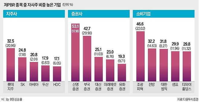 PBR이 낮은 대표 업종인 증권업 가운데 자사주 비중이 높은 기업의 주가 상승도 두드러졌다. 자사주 비중이 53.1%에 달하는 신영증권은 이날 17.18% 올랐다. 장중 23% 넘게 상승하기도 했다. 부국증권(자사주 비중 42.7%)은 가격제한폭(29.90%)까지 수직 상승했다. 대신증권과 미래에셋증권도 각각 11.03%, 6.76% 올랐다.